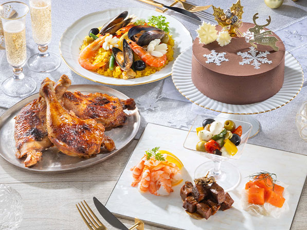 オードブル、パエリア、チキンに、4種の選べるケーキを合わせたお得なセット。