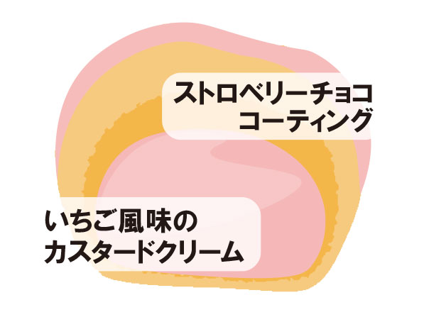 いちご風味のカスタードクリーム入り。ストロベリーチョコでコーティングしたプチシューです。