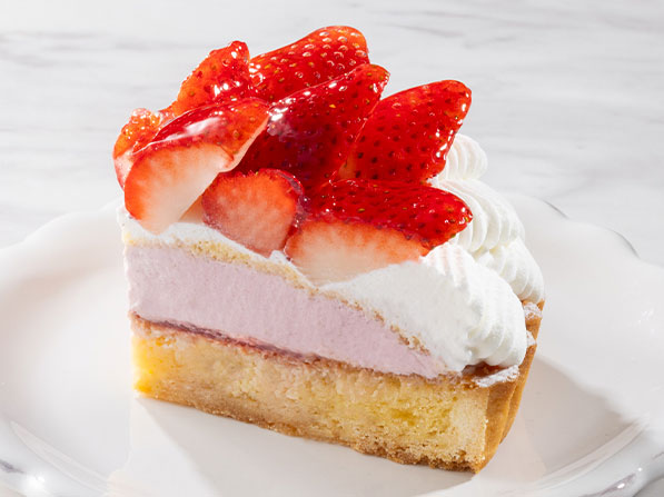 アーモンド生地のタルト台に果肉入り苺ソース、ストロベリークリーム、スポンジ、シャンティクリームを重ね苺を盛りつけました。