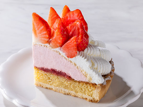 アーモンド生地のタルト台にストロベリークリーム、スポンジ、シャンティクリームを重ねあまおう苺を飾りました。