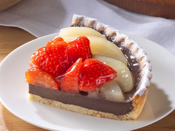 スイートとミルクの2種類のチョコレートを使用したショコラタルトにあまおうと洋梨を盛りつけました。 ※稀にフルーツの種が入っている場合がございます。
